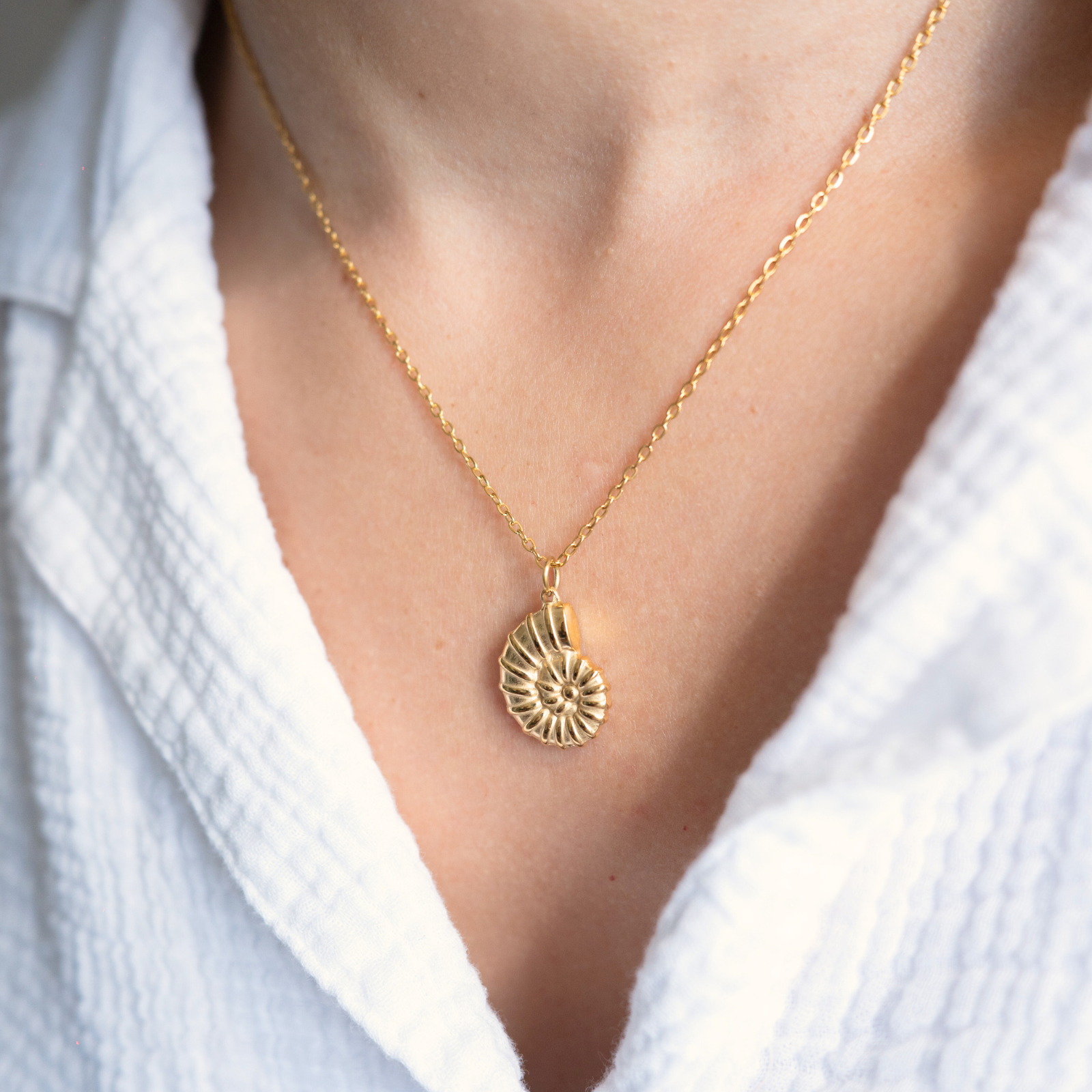 Adaptación (Adaptation) is a must-have accessory with a shell pendant. Perfect as a standalone statement, or ideal for pairing with other necklaces, this piece is crafted from 18K Gold Plated Stainless Steel, making it waterproof, hypoallergenic, and free from green or black stains on your skin after use.