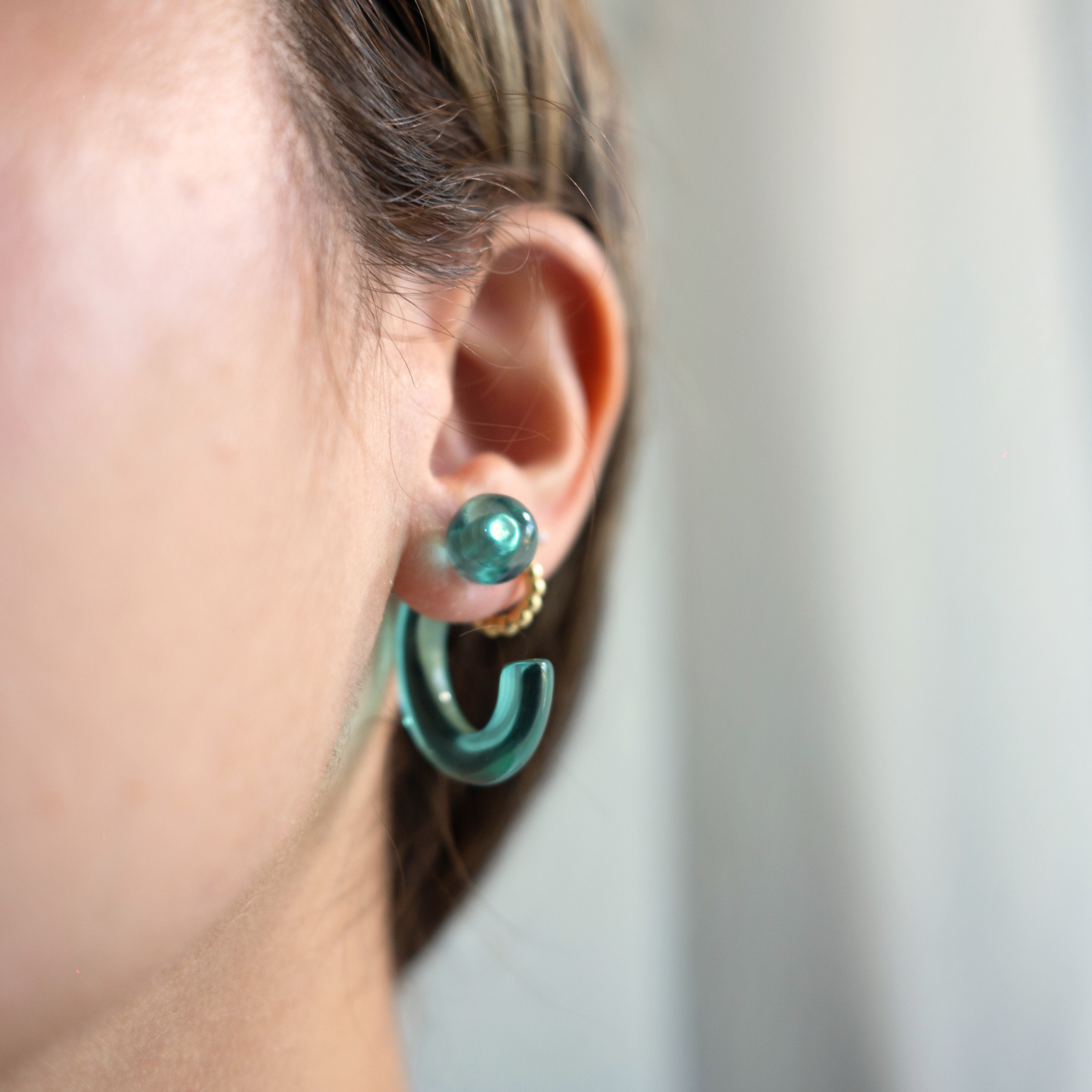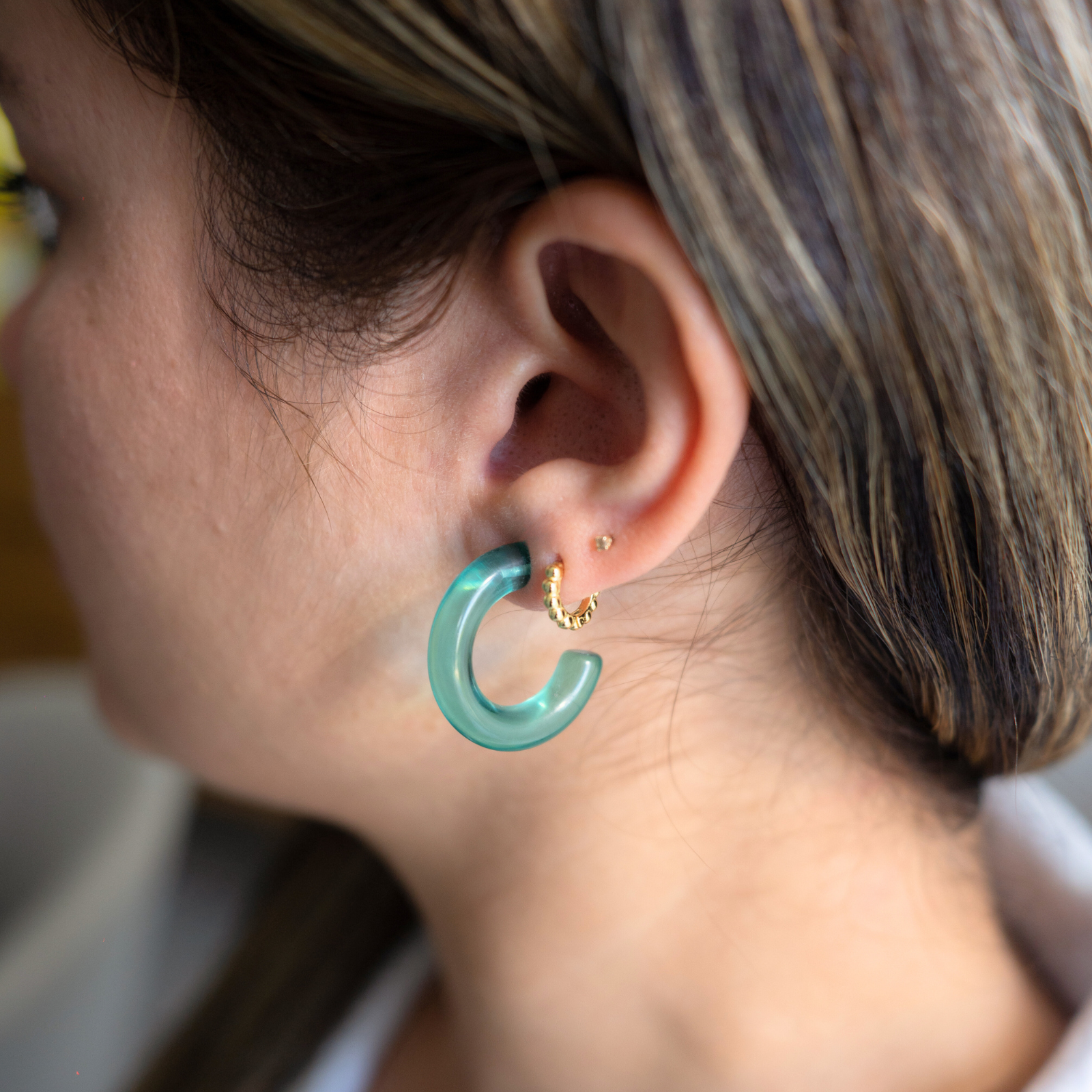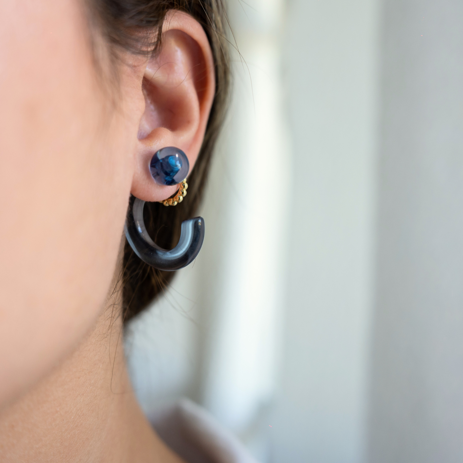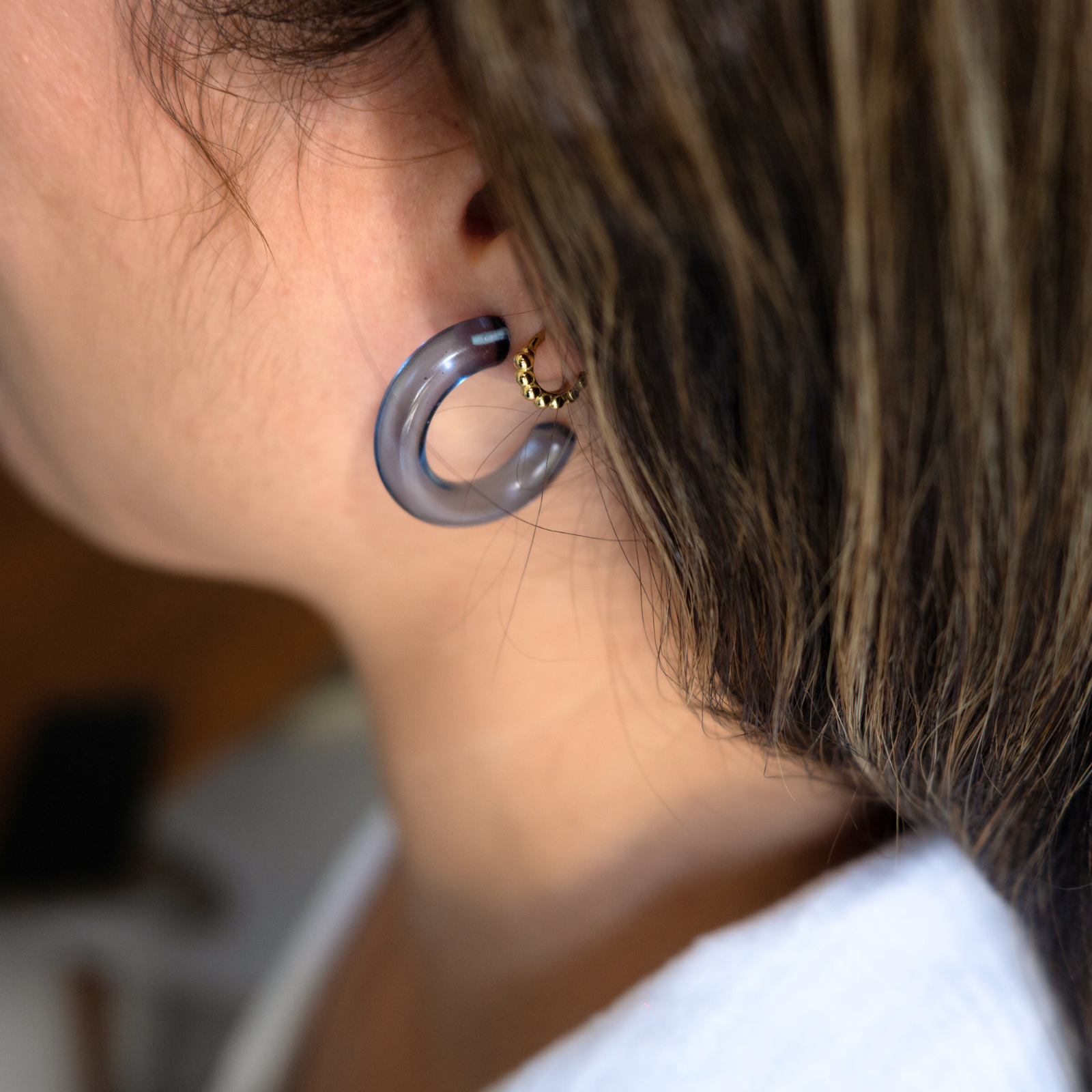 Aventuras (Adventures) is a versatile hoop that comes in three different colors (aqua, blue and clear). You can wear them the classic way with the hoop in the front or a more modern way with the hoop adorning the back. The earrings are made of acrylic material, making it waterproof, durable and lightweight.