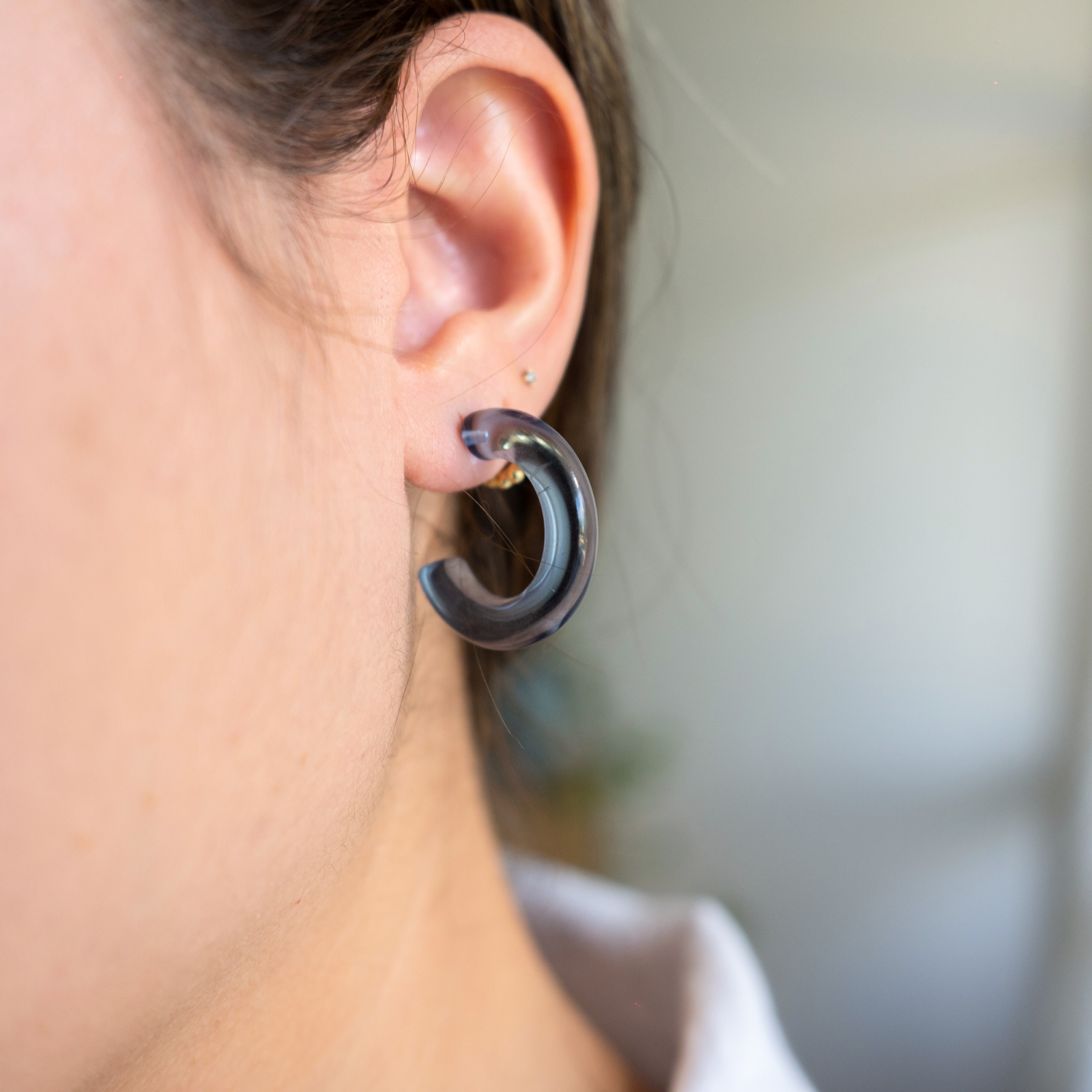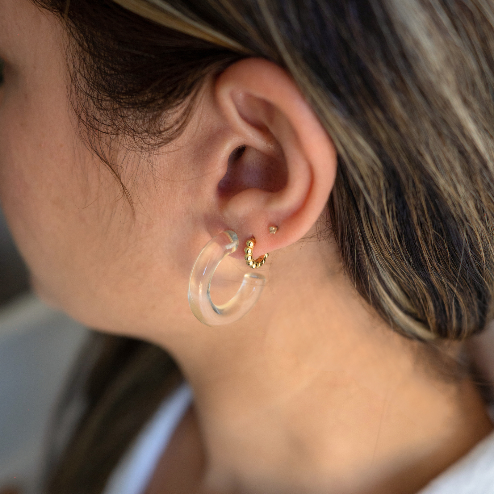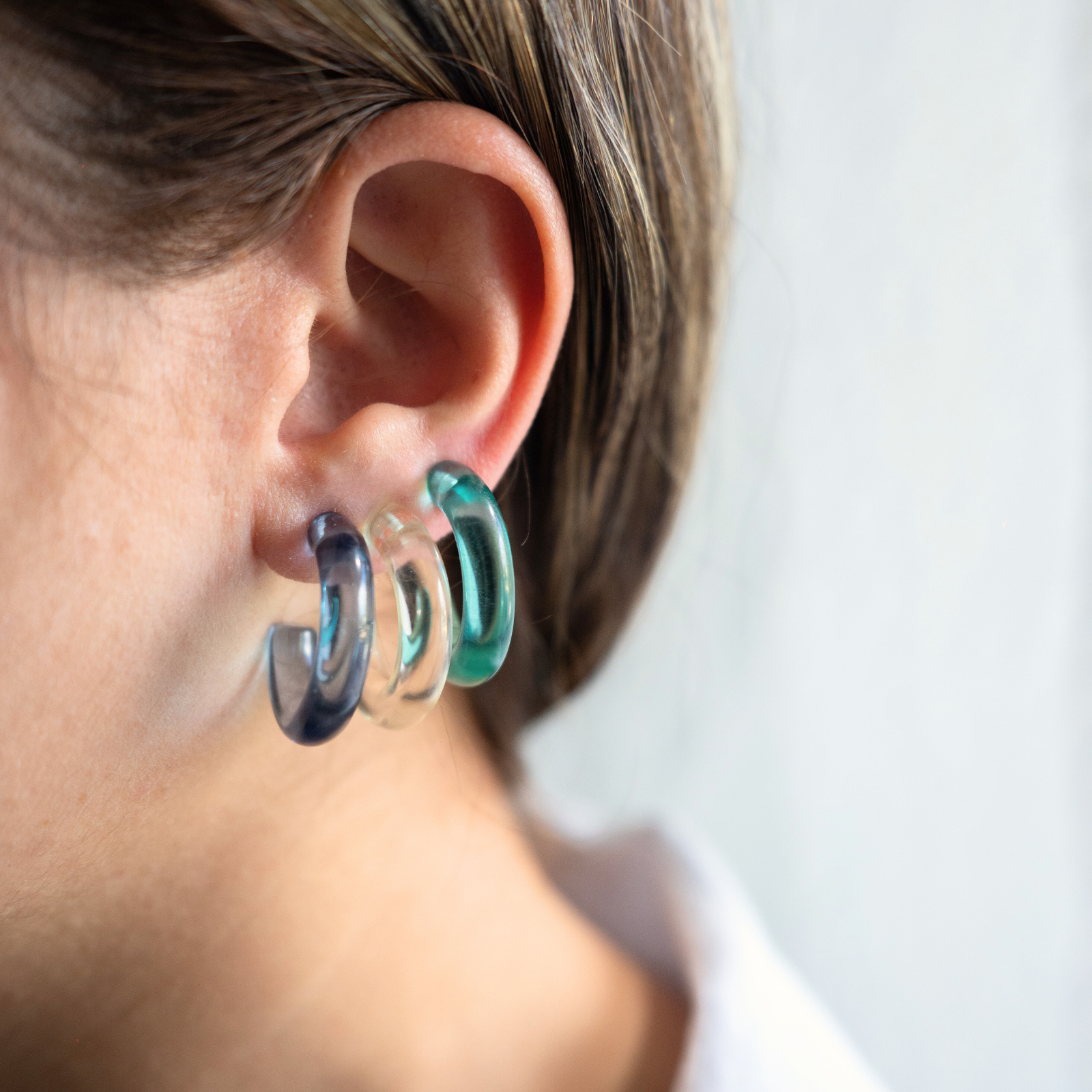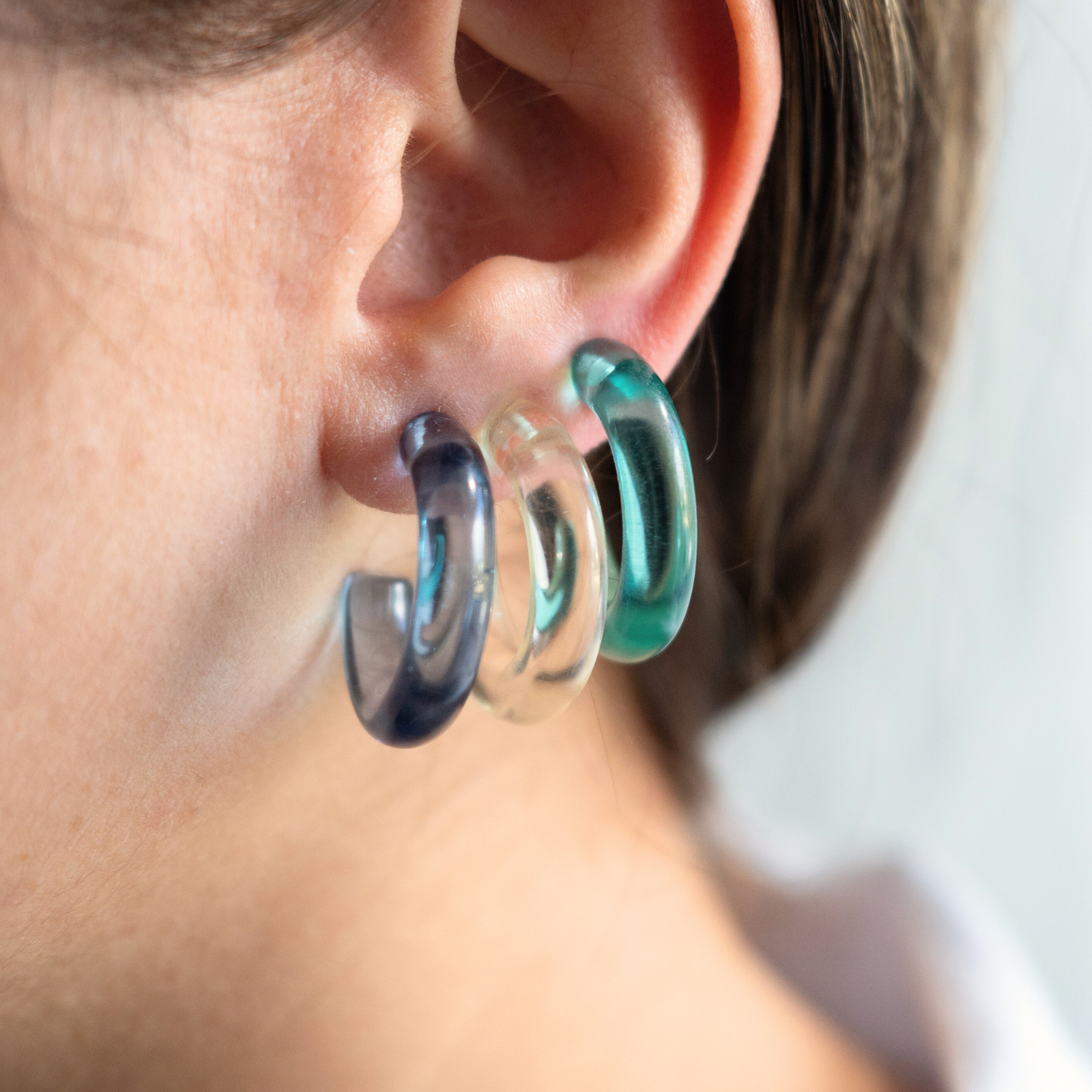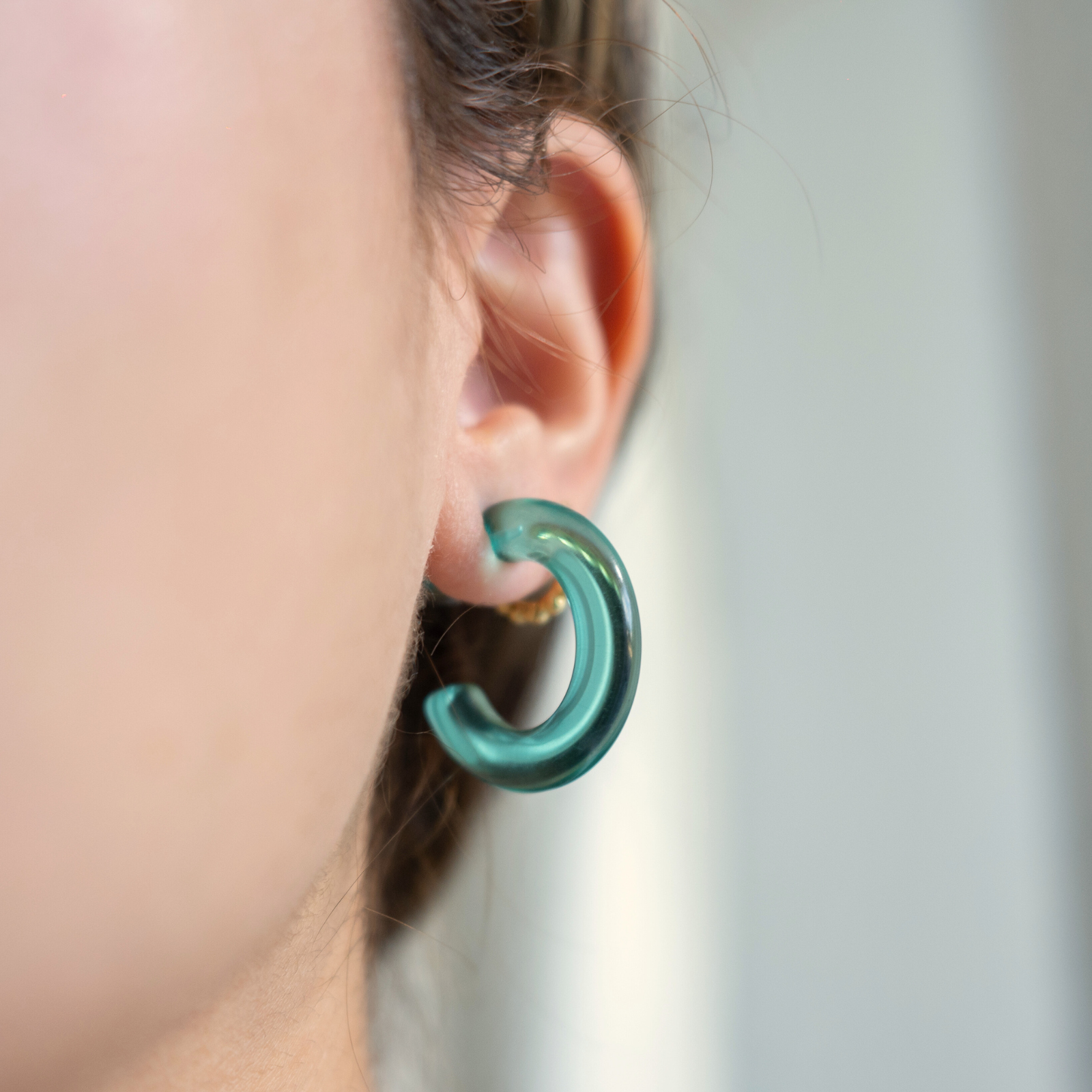 Aventuras (Adventures) is a versatile hoop that comes in three different colors (aqua, blue and clear). You can wear them the classic way with the hoop in the front or a more modern way with the hoop adorning the back. The earrings are made of acrylic material, making it waterproof, durable and lightweight.