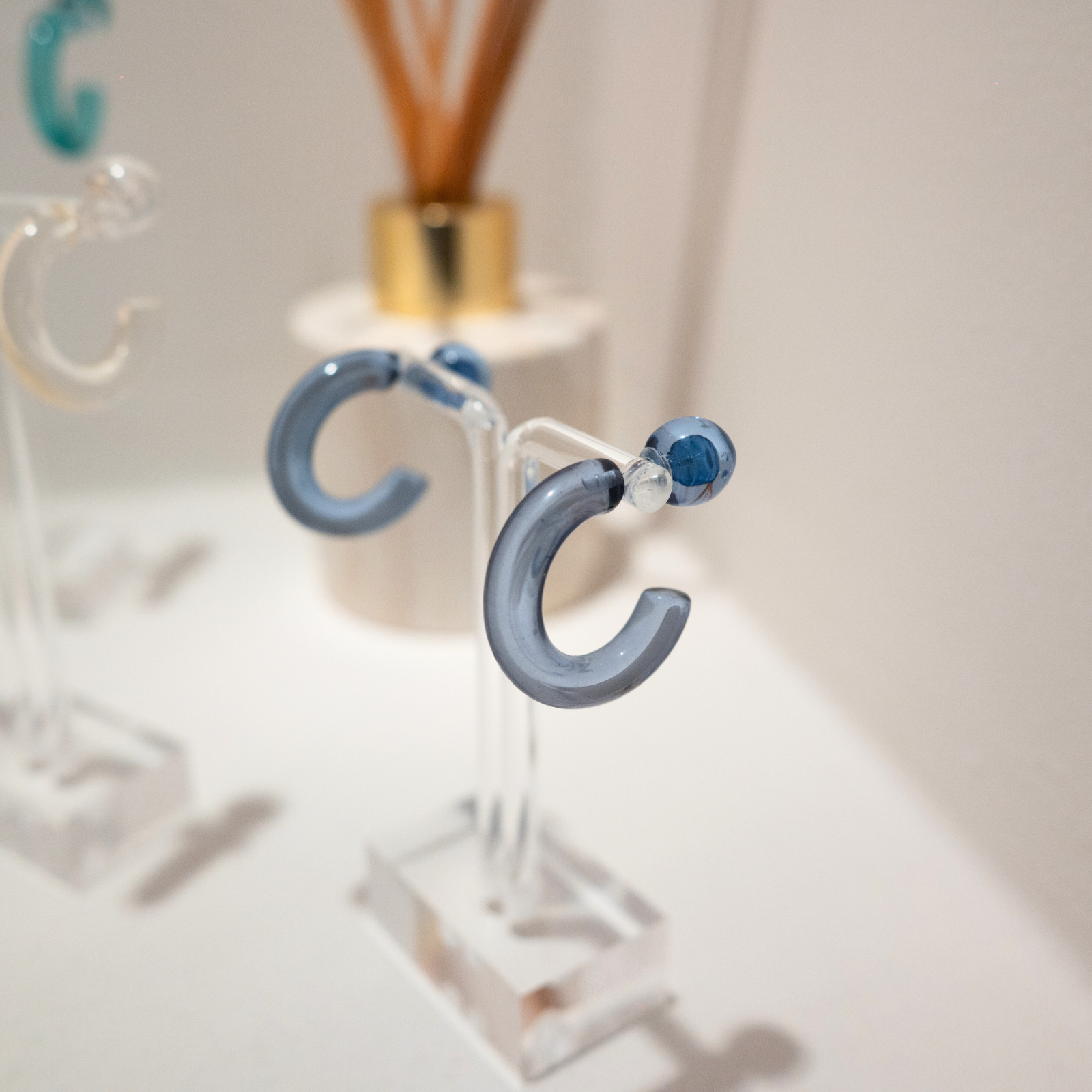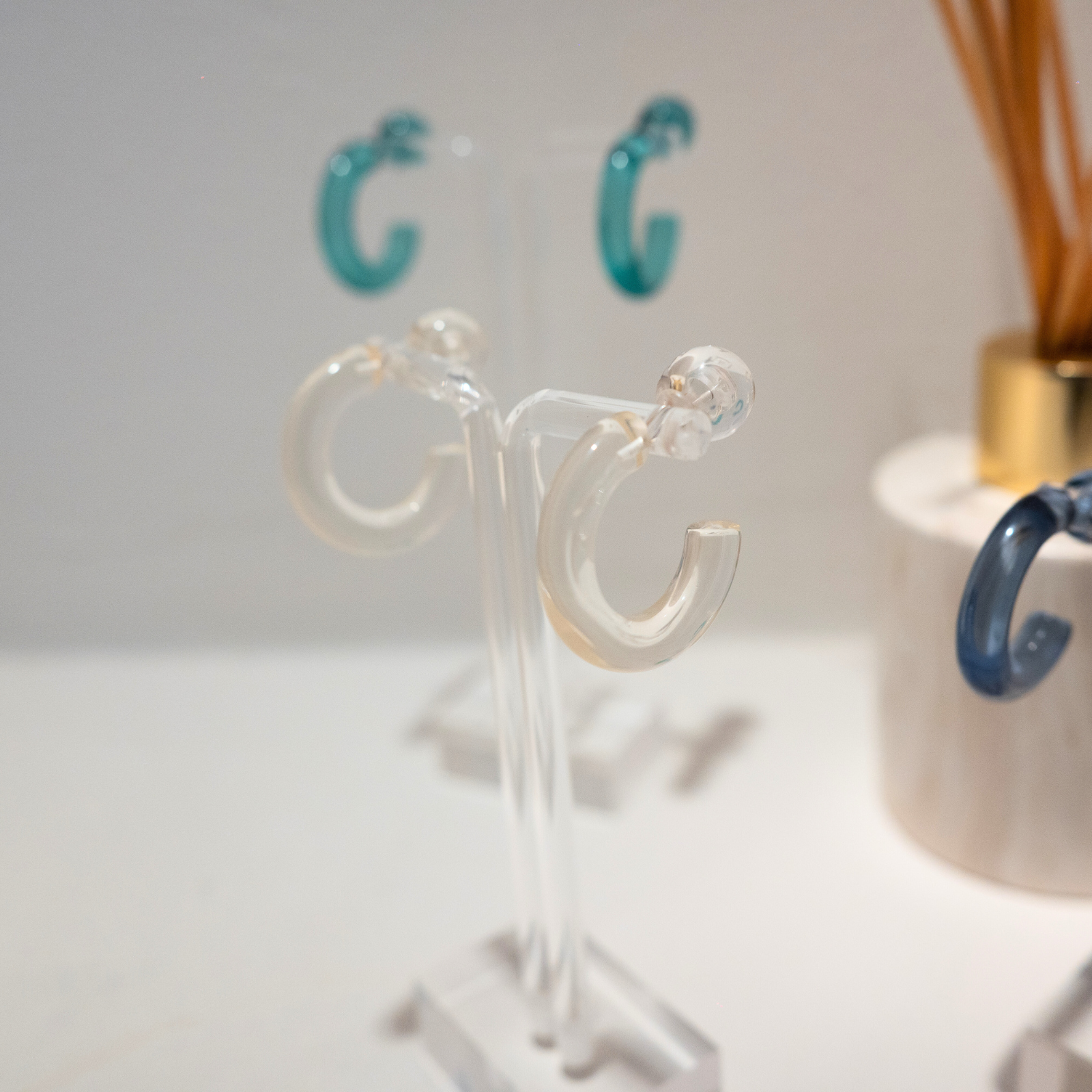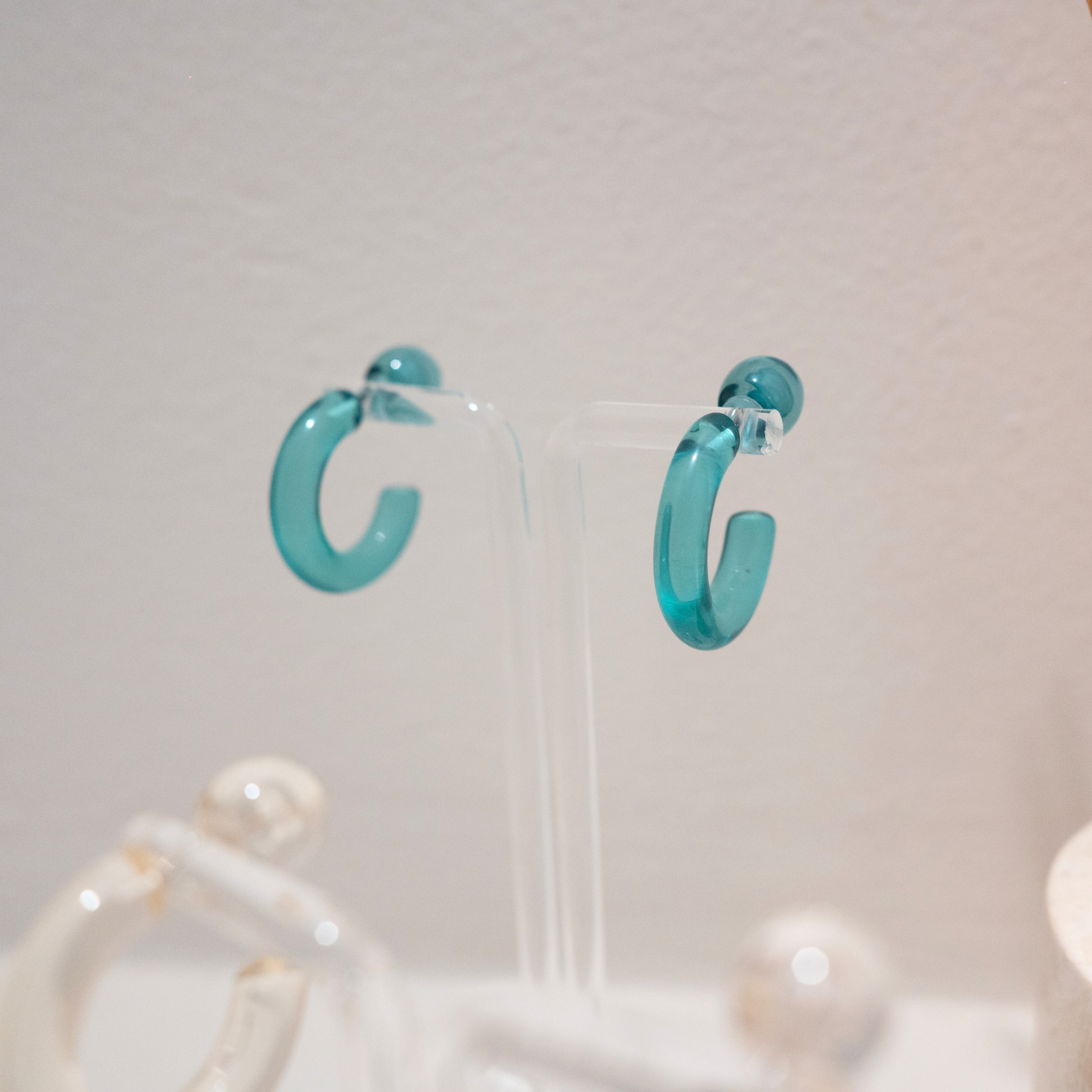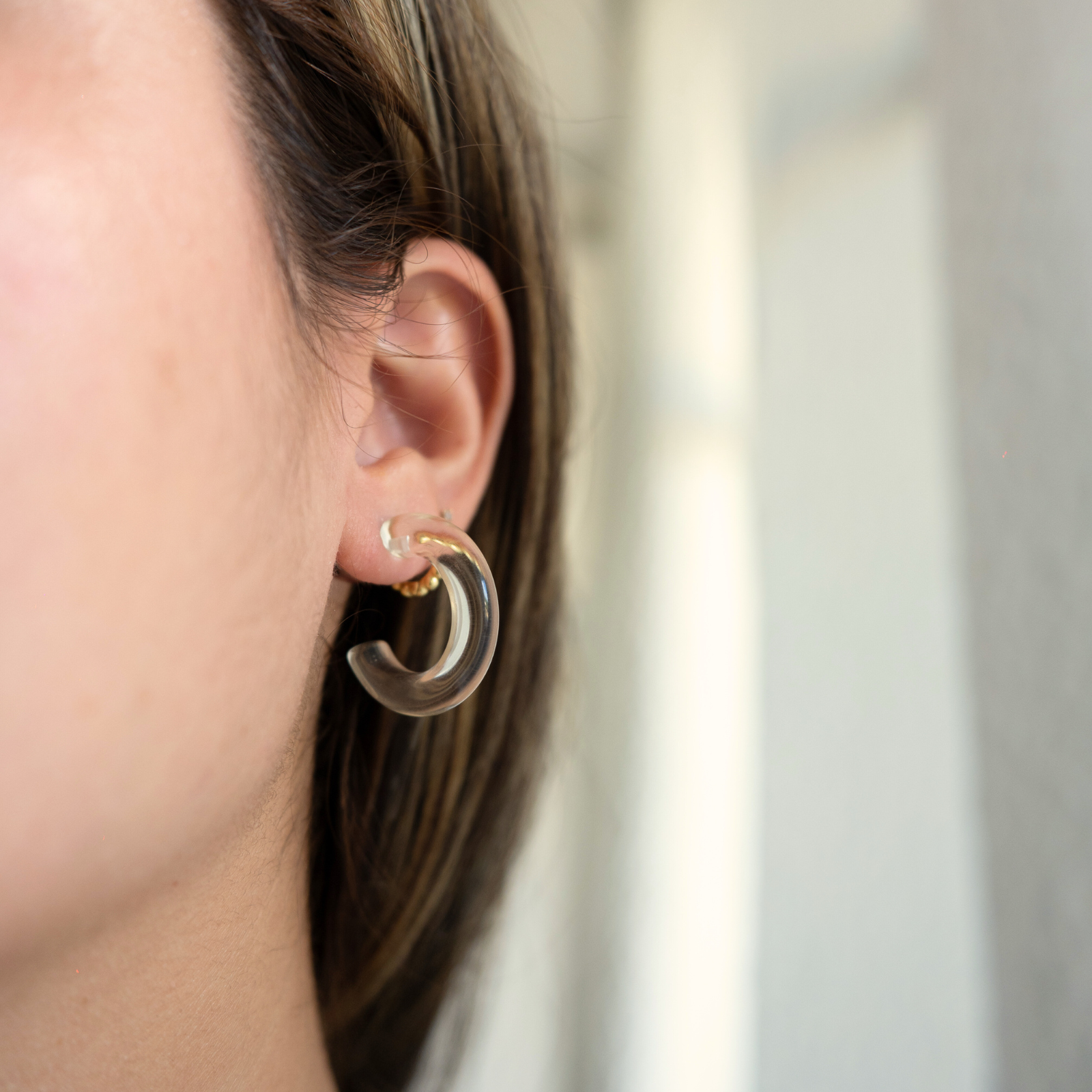 Aventuras (Adventures) is a versatile hoop that comes in three different colors (aqua, blue and clear). You can wear them the classic way with the hoop in the front or a more modern way with the hoop adorning the back. The earrings are made of acrylic material, making it waterproof, durable and lightweight.