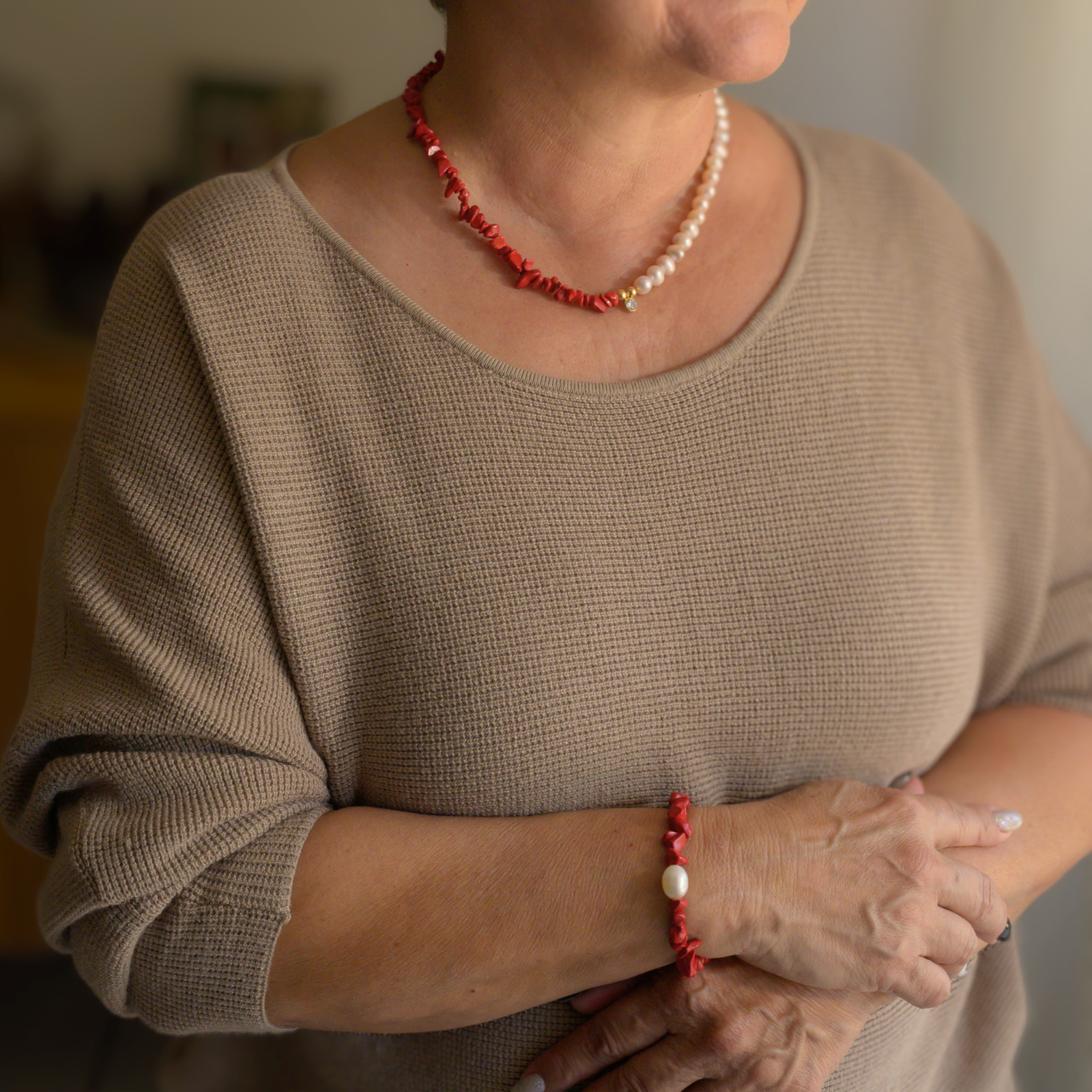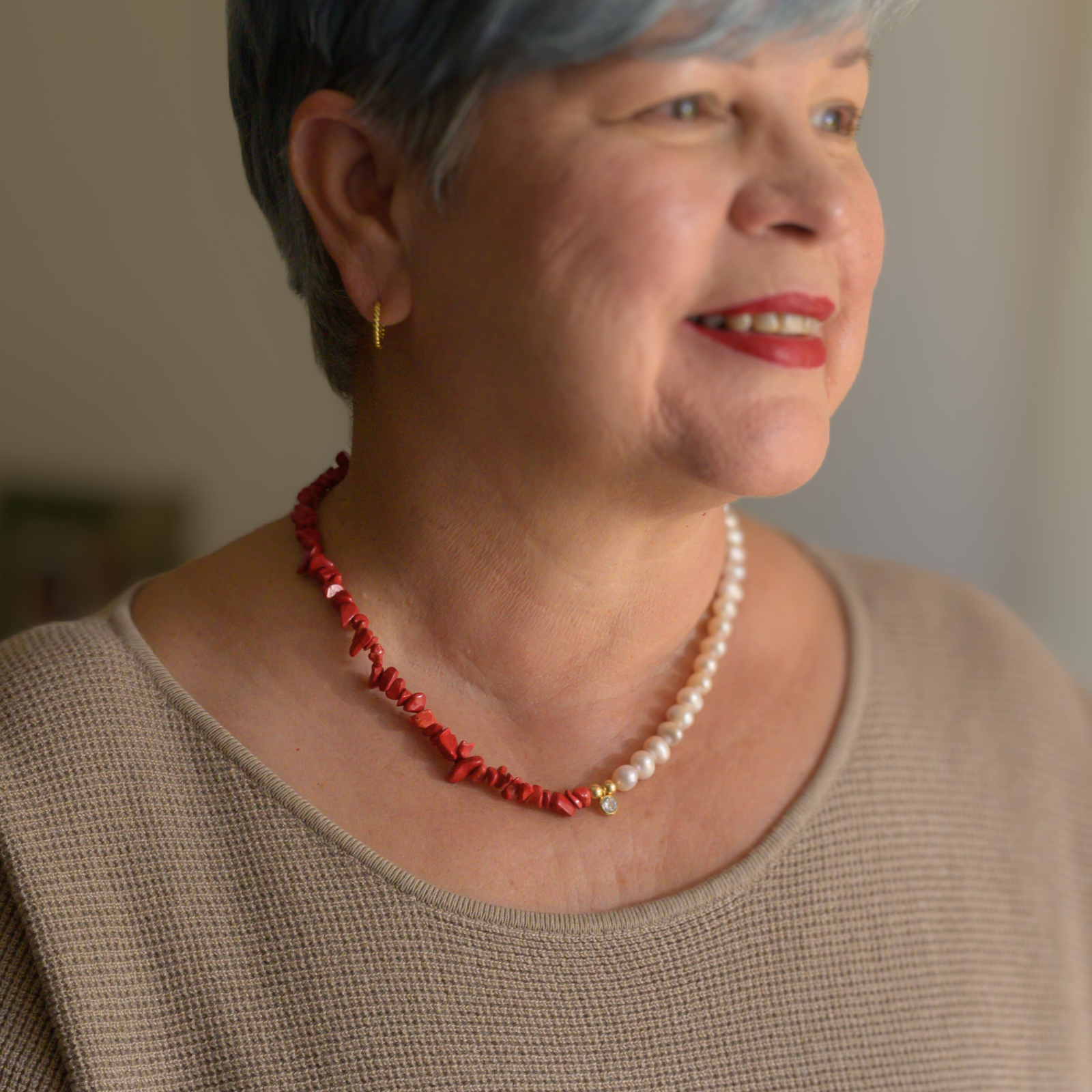 Emociones (emotions) is a handmade piece crafted with a freshwater pearl and a pop of red. Pair it with Brillo Interno Handmade Necklace for an elegant look.