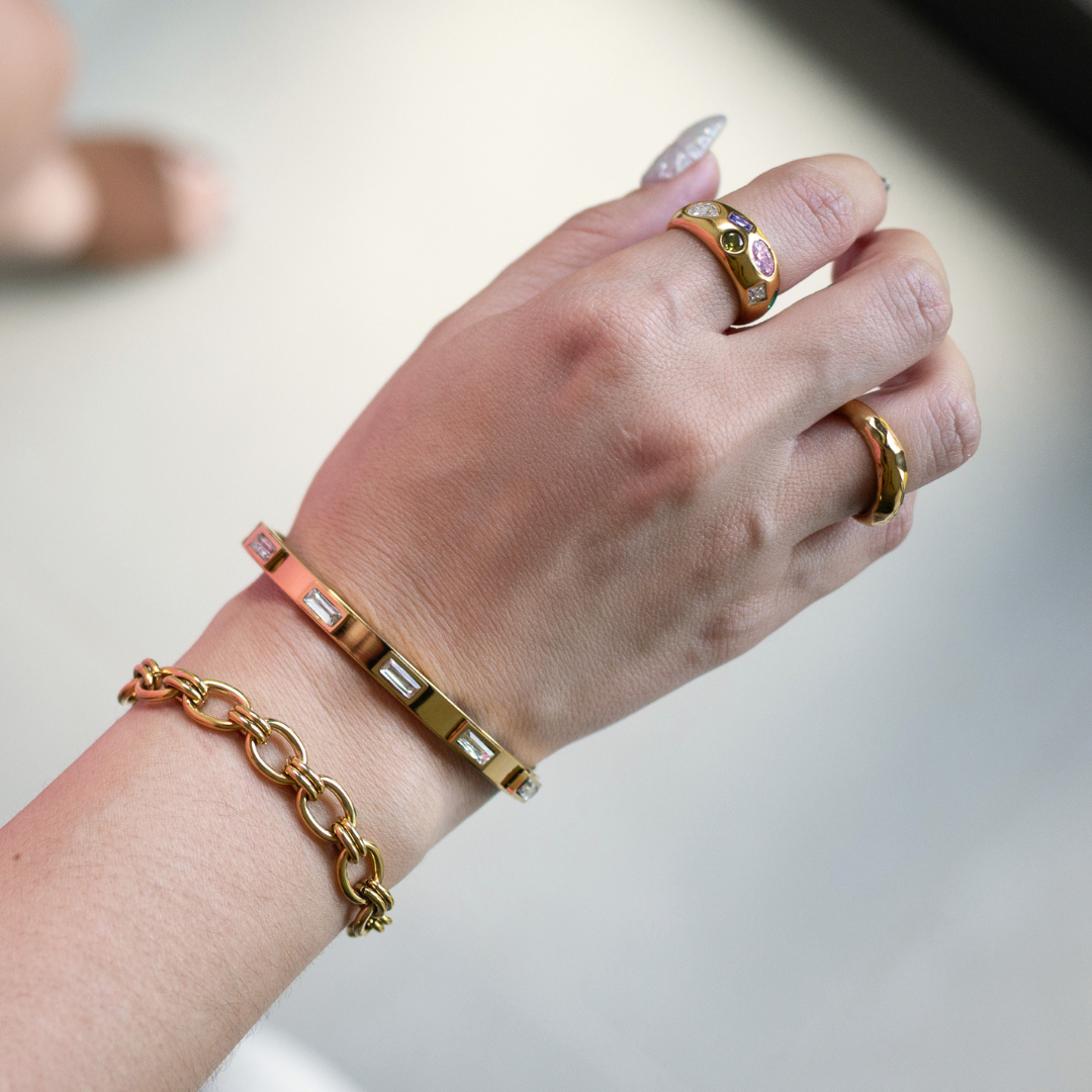 Esencia bangle is a reflection of who you are at your core, your most authentic, grounded, and radiant self. Designed with a sleek, structured silhouette and accented with delicate zirconia stones, this piece brings a refined touch of light to your everyday.