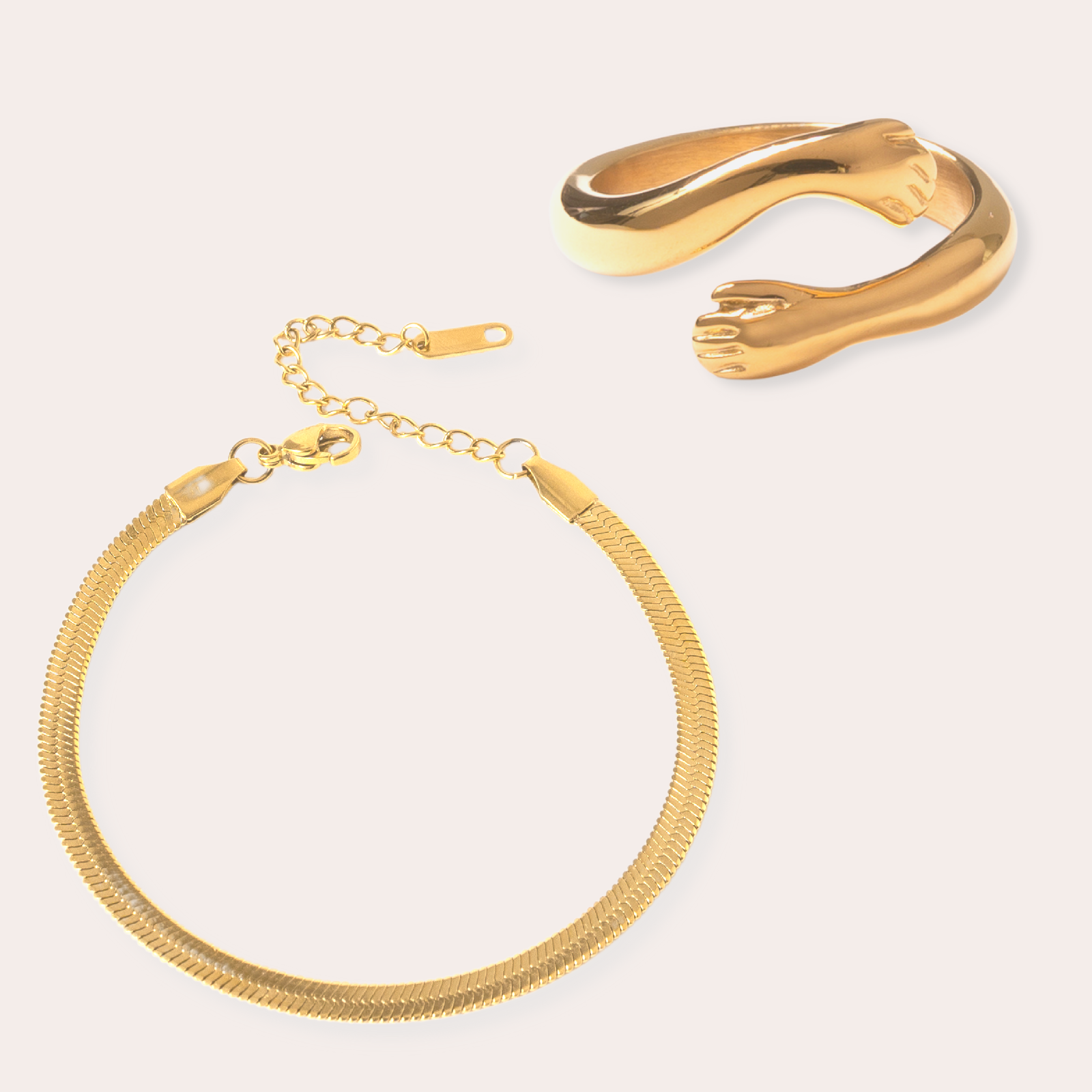 Perfect Gift Combo for the day to day. This set includes our #1 selling ring Abrazo ⟡ Ring (size 7 only) and Un Break ⟡ Snake Chain Bracelet (7.5 inches + 2” extender).