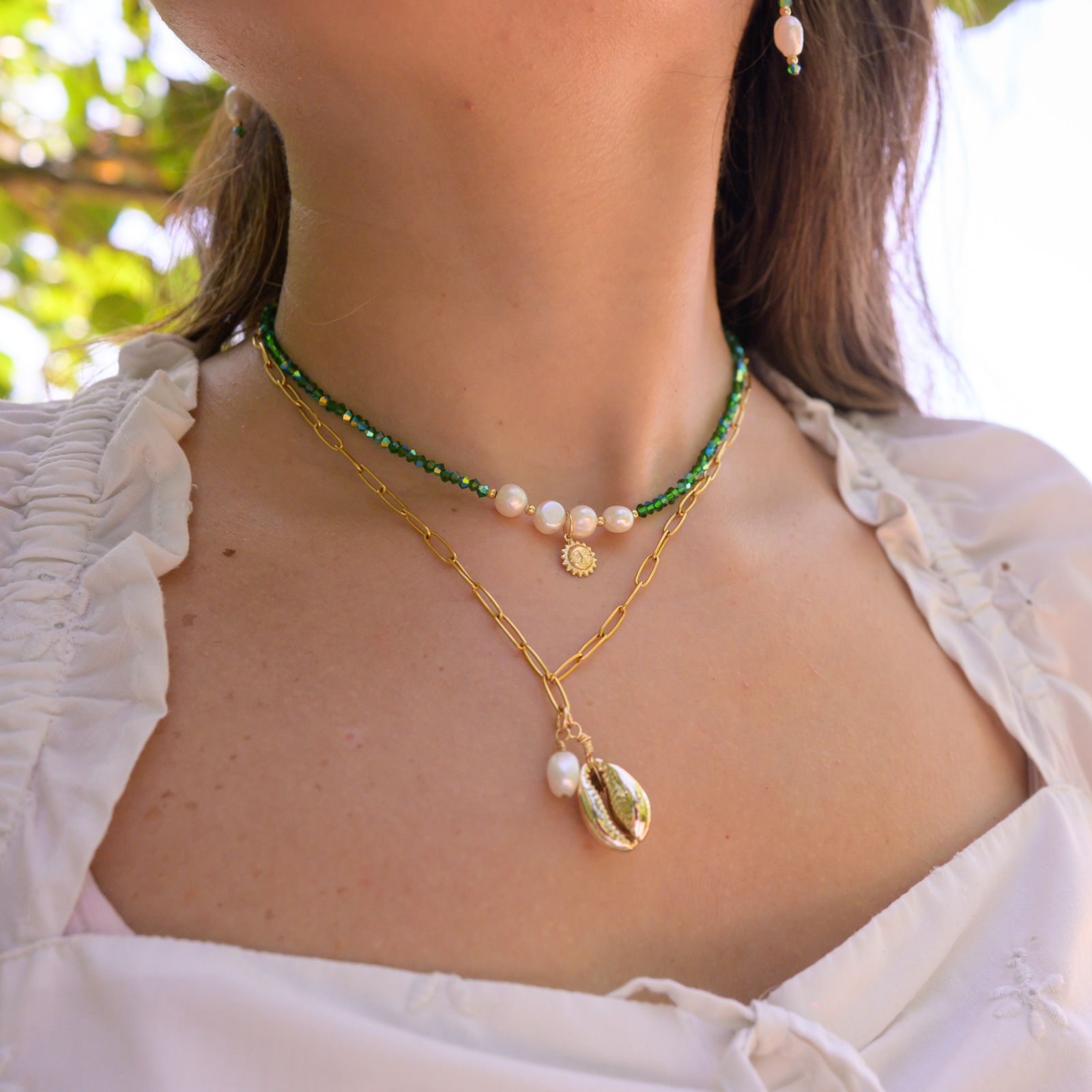 Jobos ⟡ Handmade Crystal Necklace is made with sparkly emerald green crystals, freshwater pearls, and delicate 14K Gold Filled beads and sun pendant. It's the perfect accessory for bringing a bit of summer joy into your life and giving your style a glittery boost!