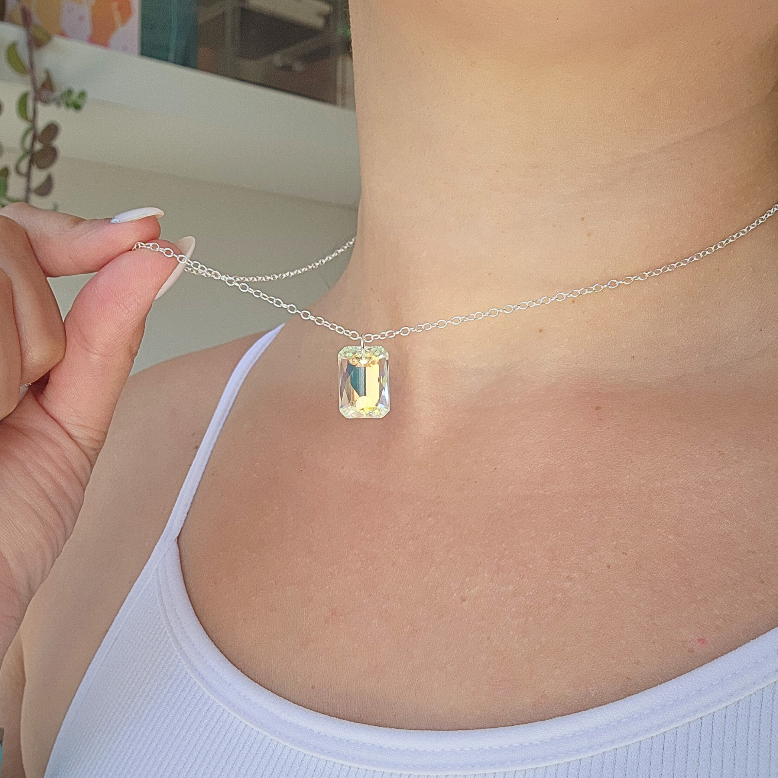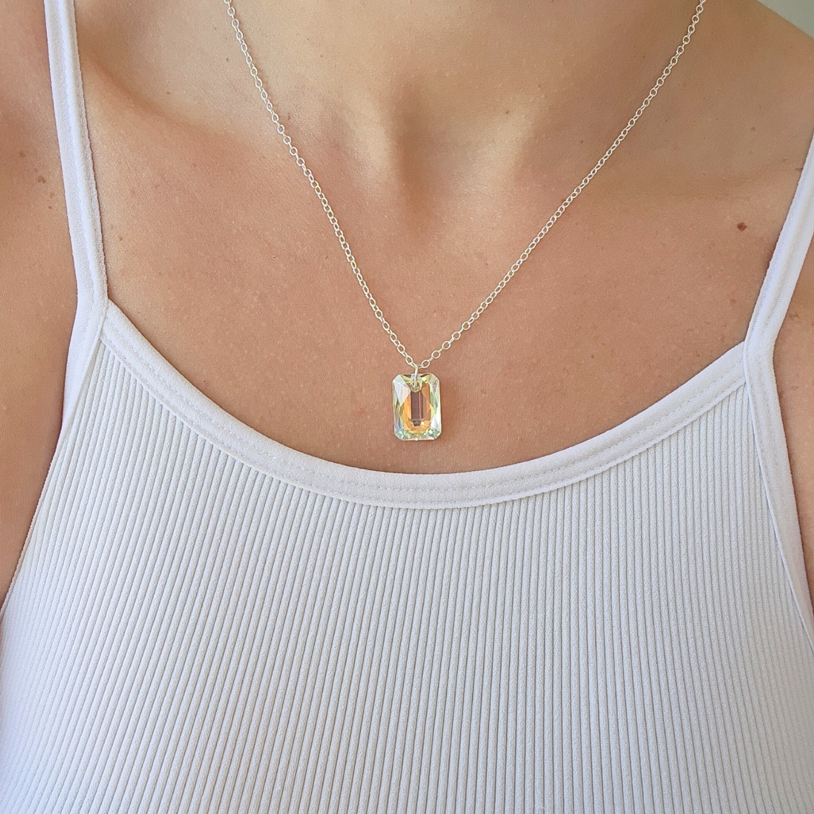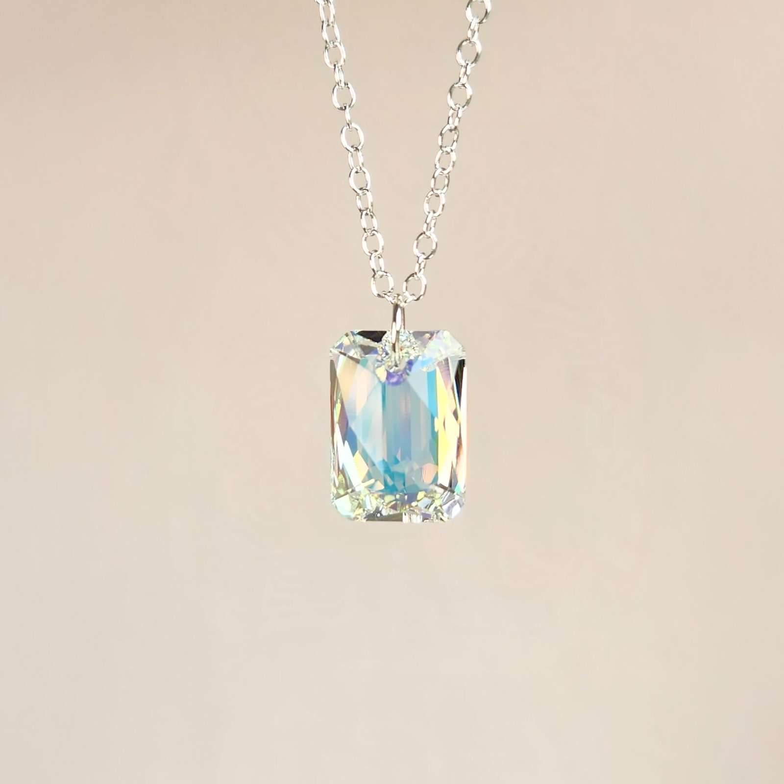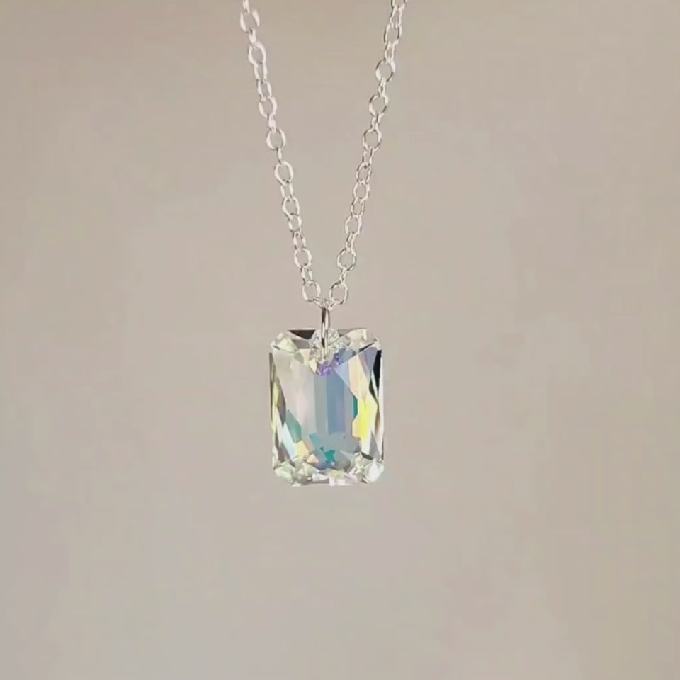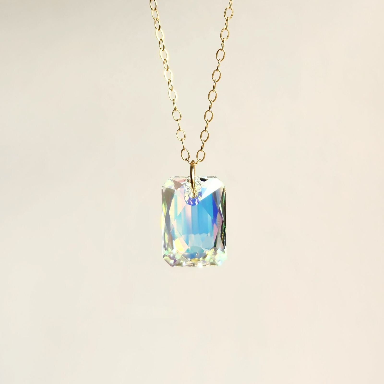 “Luz” (light) chain necklace is a handmade piece crafted with an emerald-cut crystal pendant with an aurora borealis effect. It's made with high quality 14K Gold Filled or Sterling Silver chain and closures. Its beauty cannot be explained, and it’s even more beautiful in person (if that’s even possible!).