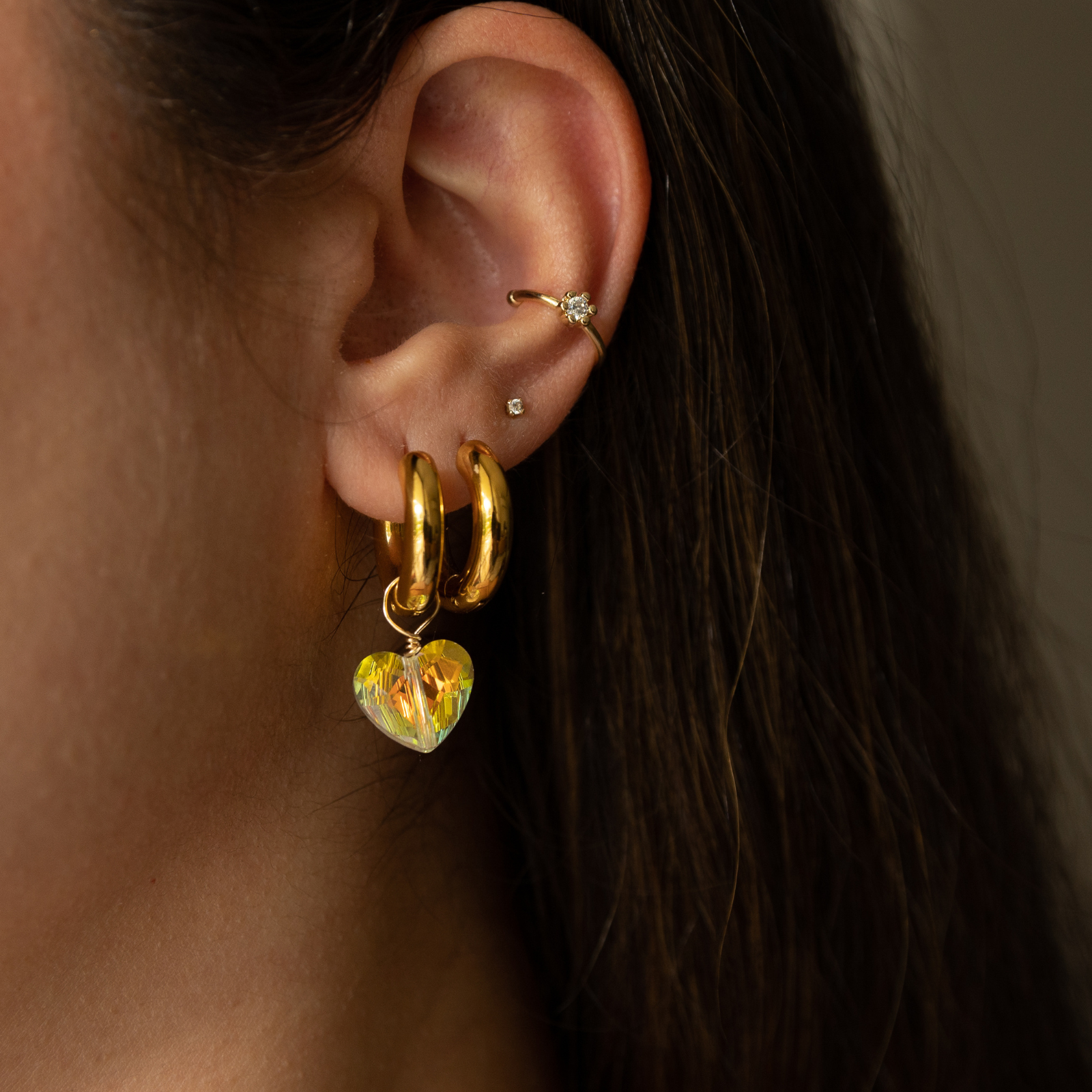Naciste ⟡ Crystal Charm Hoops are made with a heart-shape crystal that has an aurora borealis effect to show off your unique style! Have fun creating your unique designs with these hoops as you can easily add or remove charms to your liking. Our hoops are made of durable materials so you can wear everyday without fear of tarnish.