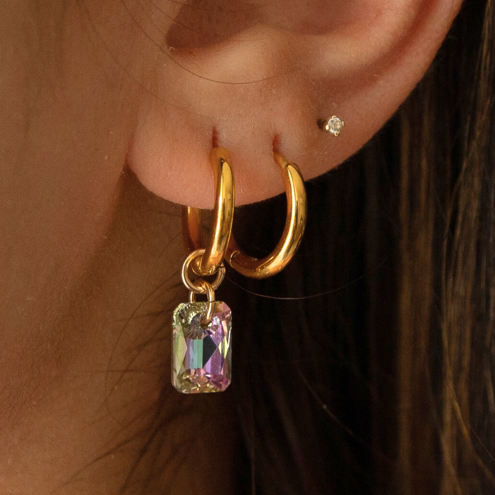 Esencia (essence) ⟡ Crystal Charm Small Hoops features an emerald-cut vitrail light crystal to show off your unique style! Have fun creating your unique designs with these hoops as you can easily add or remove charms to your liking. Our hoops are made of durable materials so you can wear everyday without fear of tarnish.